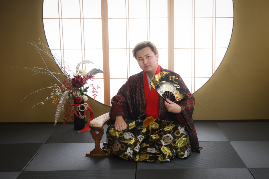千葉市美浜区のフォトスタジオ「男性袴館幕張本店」の男性袴フォトプランのお写真です。和室スタジオでお撮りしたご成人様の素敵なポートレートです。