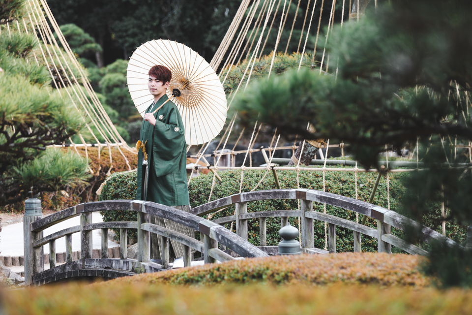 和装姿で、日本庭園「見浜園」でのロケーション撮影をさせていただきました。
