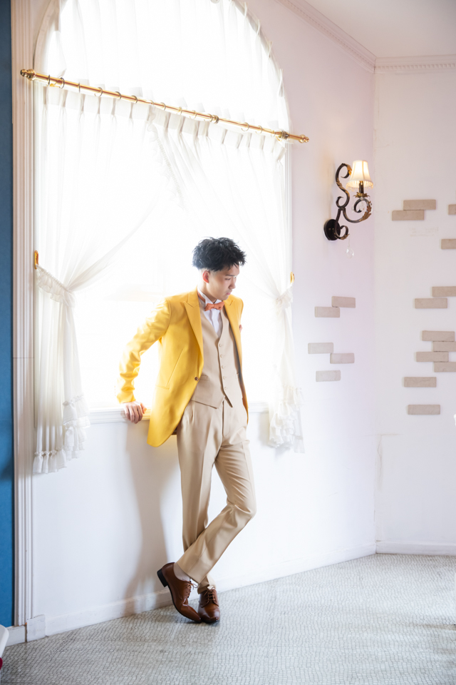 お兄様は寡黙な印象ながらも、一つひとつのポーズや表情に真摯に向き合っていただき、最後まで撮影を完走されました。スーツでの撮影では落ち着いた雰囲気と爽やかさを兼ね備えた一枚に仕上がりました。