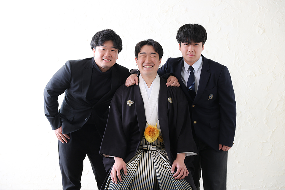 2025/11/29 「とびっきりの笑顔で!」 ブログ 市川店 市川市のフォトスタジオ「男性袴館 市川店」のスタジオにて撮影された成人式を迎えた男性のお写真です。 主役様を囲むようにお立ちになられたご兄弟様 仲の良い様子がおうかがいできる1枚です。 最初は普通の表情でお撮りしていましたが、フォトグラファーが「仲いいの?じゃあとびっきりの笑顔で!」とお声掛けしてお撮りさせていただきました。 撮影後アンケートには「いろいろなポーズを撮ってもらってよかったです。弟の時もまた来たいと思います」とコメントをいただきました。 Photo by Ichikawa 該当店舗 市川店