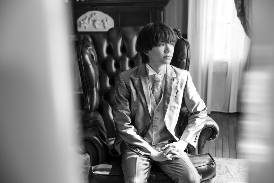 横浜店人気の英国風邸宅 応接室スタジオで、タキシード姿のご成人様をお撮りした素敵なポートレートです。