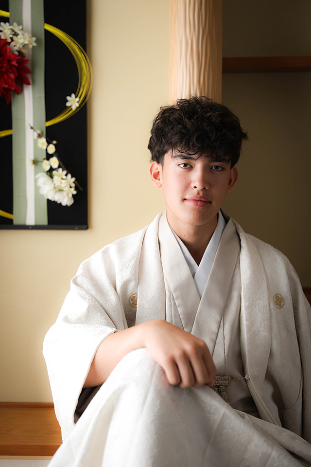まだ成人には達していませんが、「せっかくの機会だから」と白を基調とした紋付きの羽織袴をお召しになり、1人撮影も行いました。