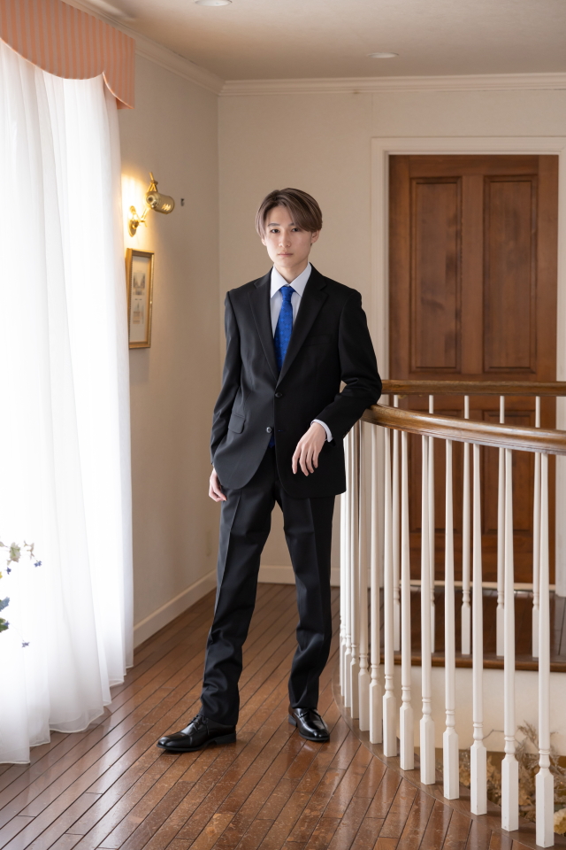 横浜店人気の2Fロビーで、スーツ姿のご成人様をお撮りした素敵なポートレートです。