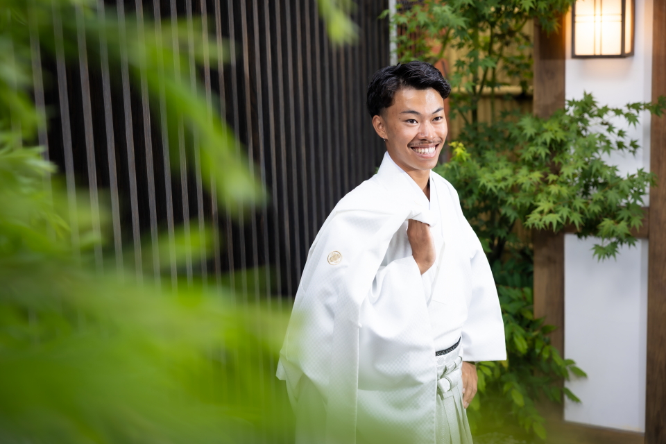 横浜店人気の和風庭園スタジオで、羽織袴姿のご成人様をお撮りした素敵なポートレートです。