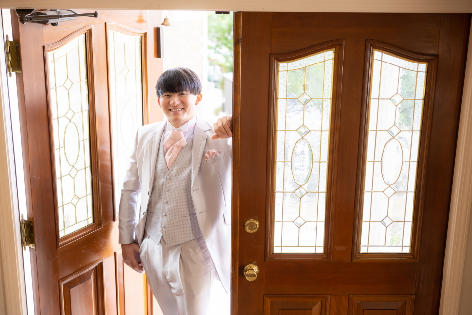 横浜店のエントランスでタキシード姿のご成人様をお撮りした素敵なポートレートです。