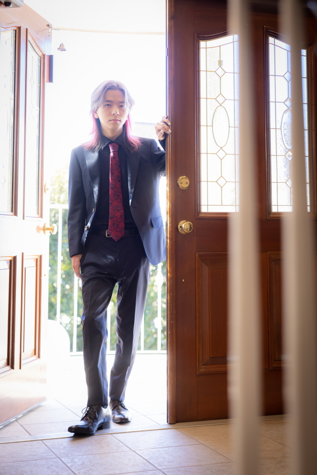 横浜店のエントランスで、スーツ姿のご成人様をお撮りした素敵なポートレートです。