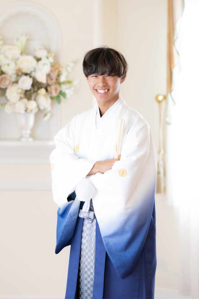 白と青の爽やかな羽織をお召しになったご成人様。