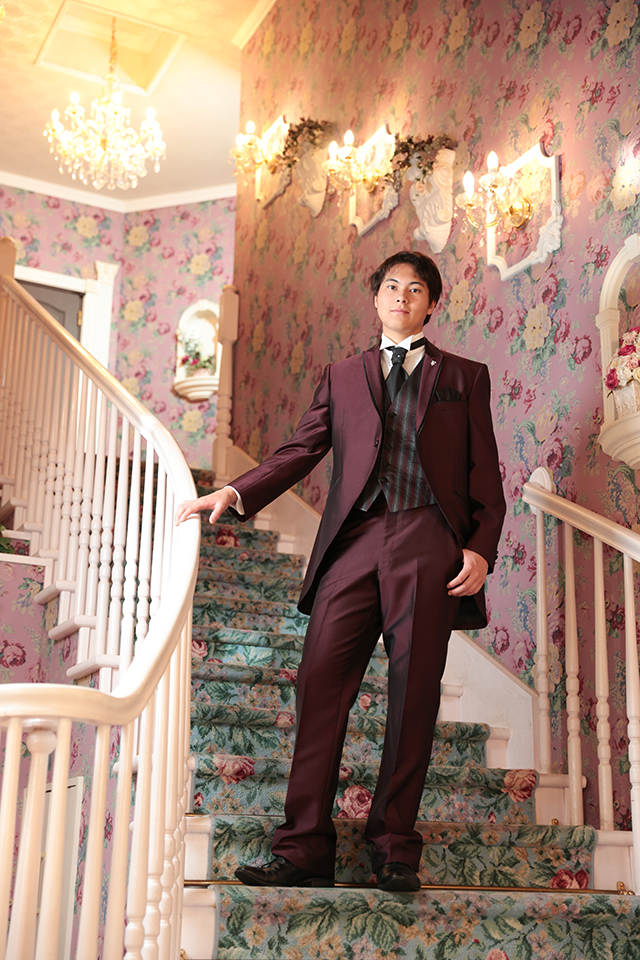 お客様はボルドーのスーツをお召しになりましたので、お城を思わせる華やかな階段でも撮影させていただきました。