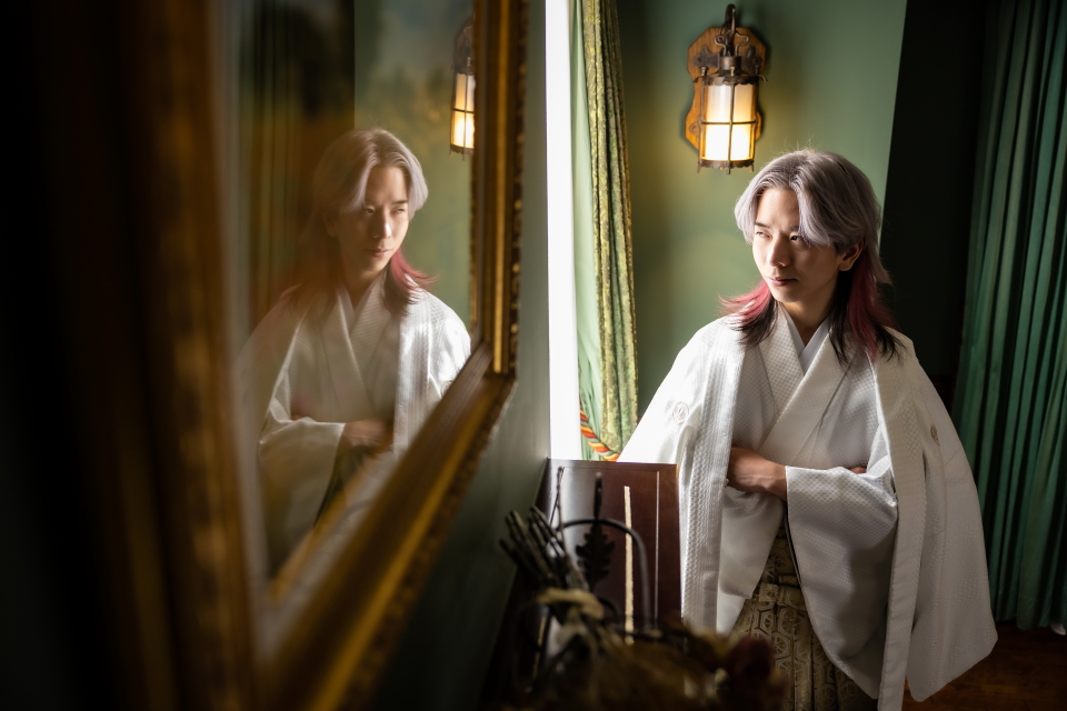 羽織を肩にかけて外を眺める様子をお撮りしたお写真です。