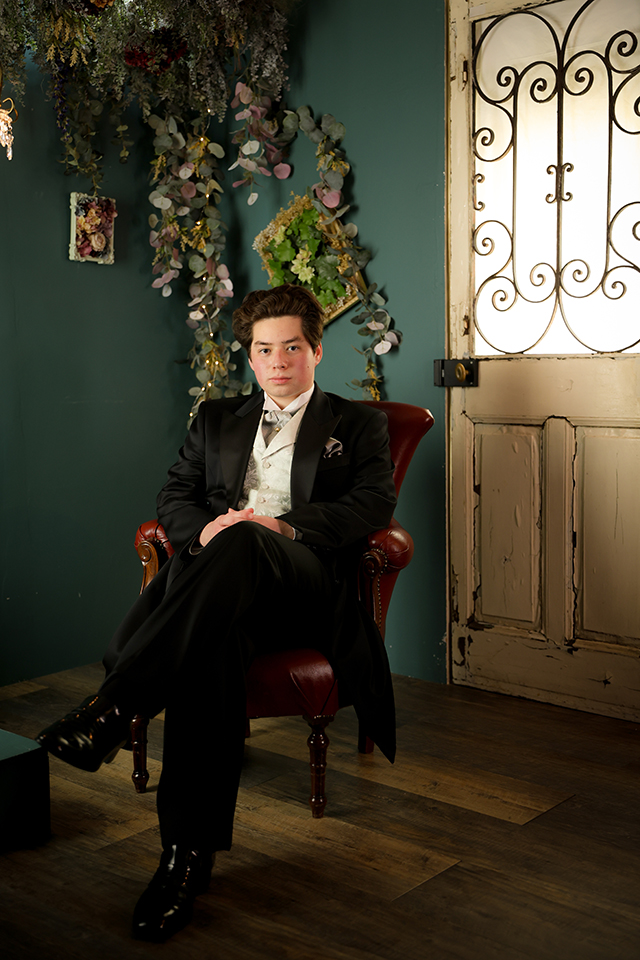 タキシードでは他にも、自然光差し込むアーチ窓やゴージャスな金の椅子などに座ったりと様々なシチュエーションでお撮りさせていただきました。