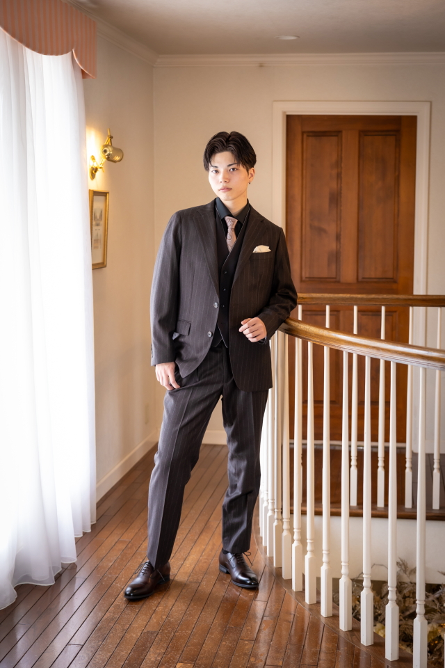 ブラウンのおしゃれなスーツは、成人式のためにお作りになったそうで、ご成人様にとてもよくお似合いでいらっしゃいました。
