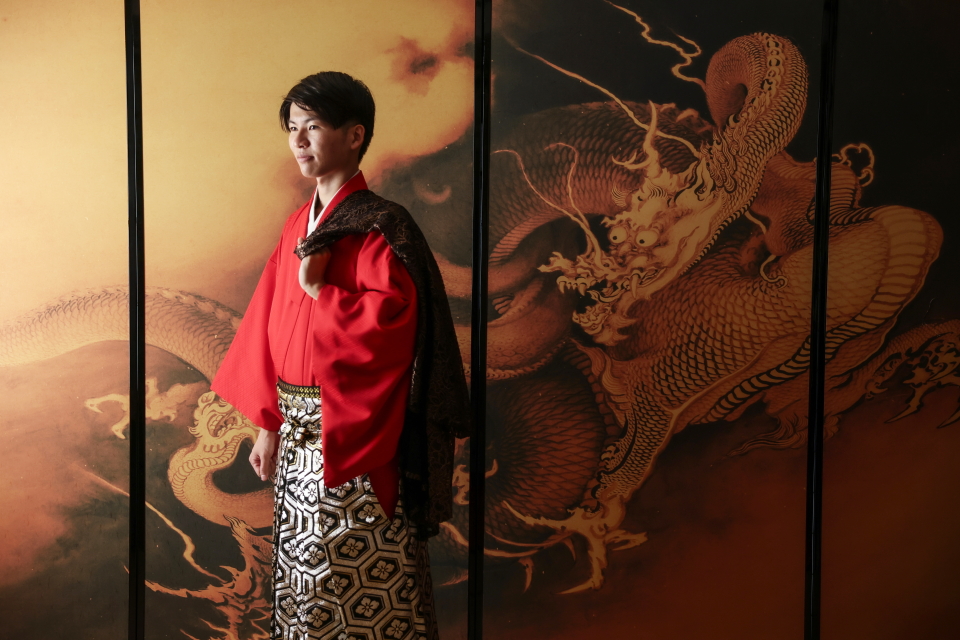 横浜店人気の龍の襖絵の前で、羽織を肩に掛けた凛々しいポートレイトです。