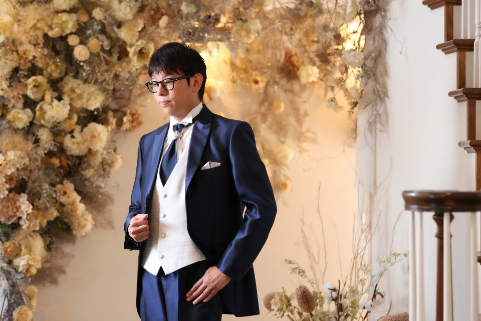 当店人気の花アーチのシーンで、ネイビーのタキシードを着て佇む素敵なポートレイトです。